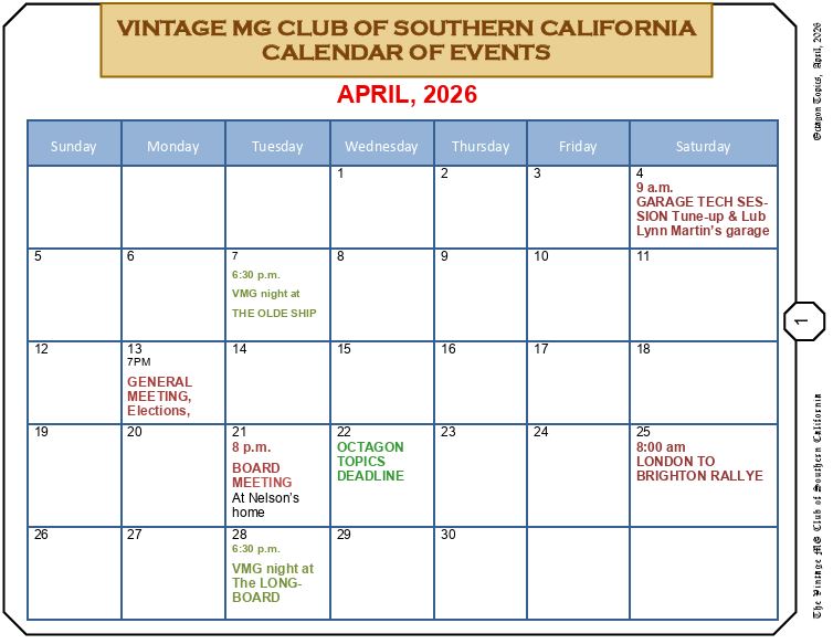 Welcome to Southern California’s definitive source for pre-war and MG T-Series enthusiasts. Come join the largest and most active Vintage MG Car Club in the Western USA. |